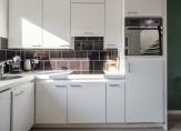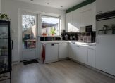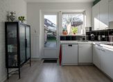 De half open keuken is voorzien van een hoekkeuken in lichte kleurstelling met een aanrechtblad waarin verwerkt een enkele spoelbak. Als (inbouw)apparatuur een elektrische kookplaat, afzuigkap, oven, koelkast en een vaatwasser. De keuken is voorzien van hoge bovenkasten en vanuit de keuken is er directe toegang tot de achtertuin.