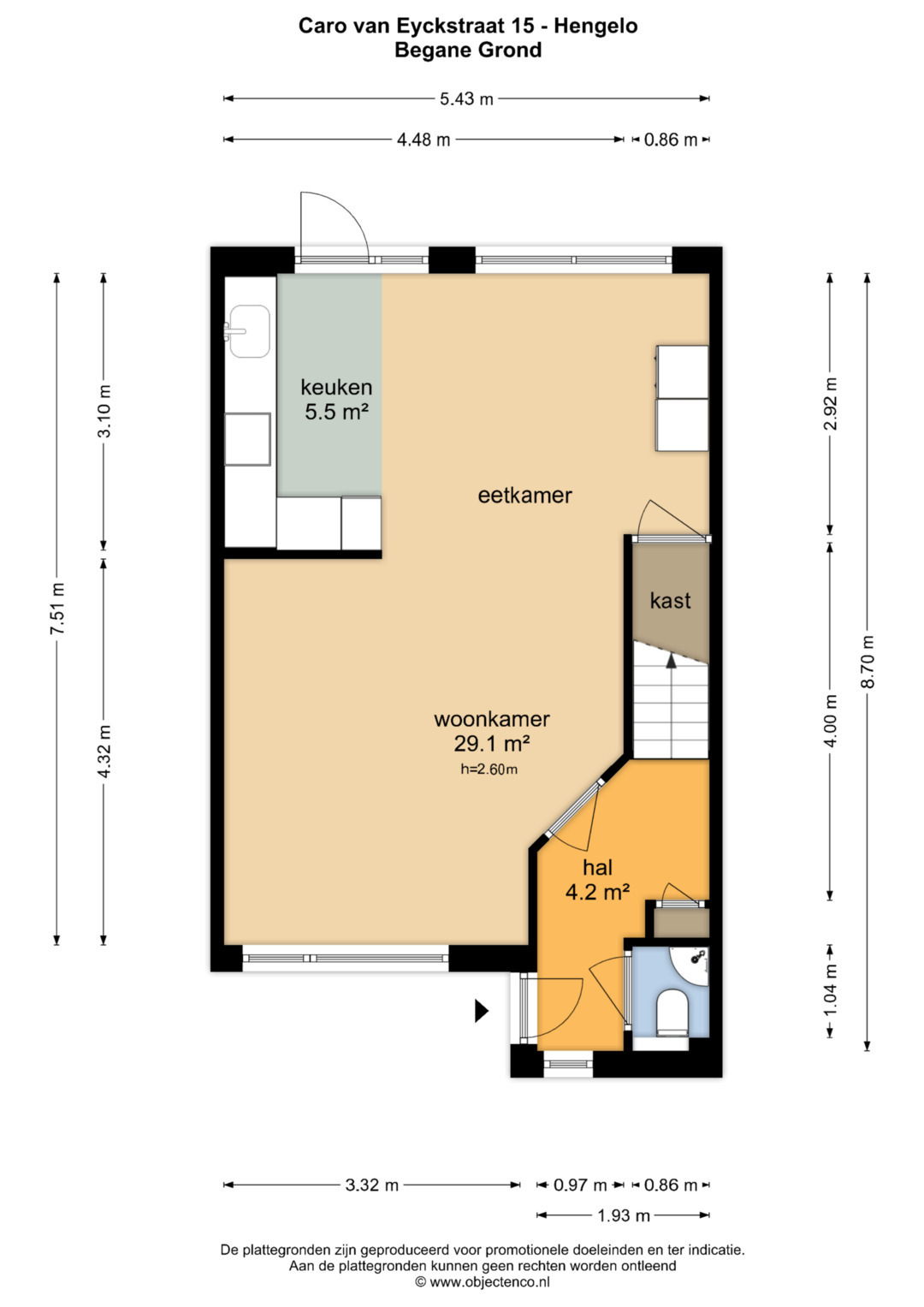 Entree/hal met meterkast, toilet met fontein en vaste trapopgang naar de eerste verdieping, woonkamer, woonkeuken en een provisiekast.
