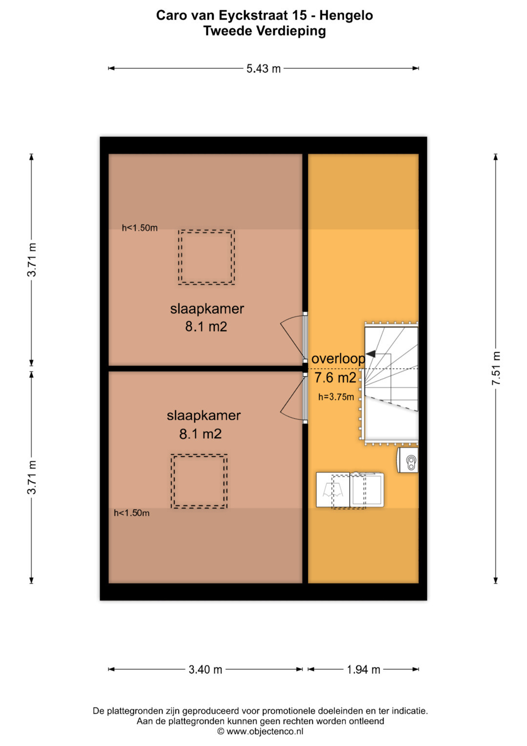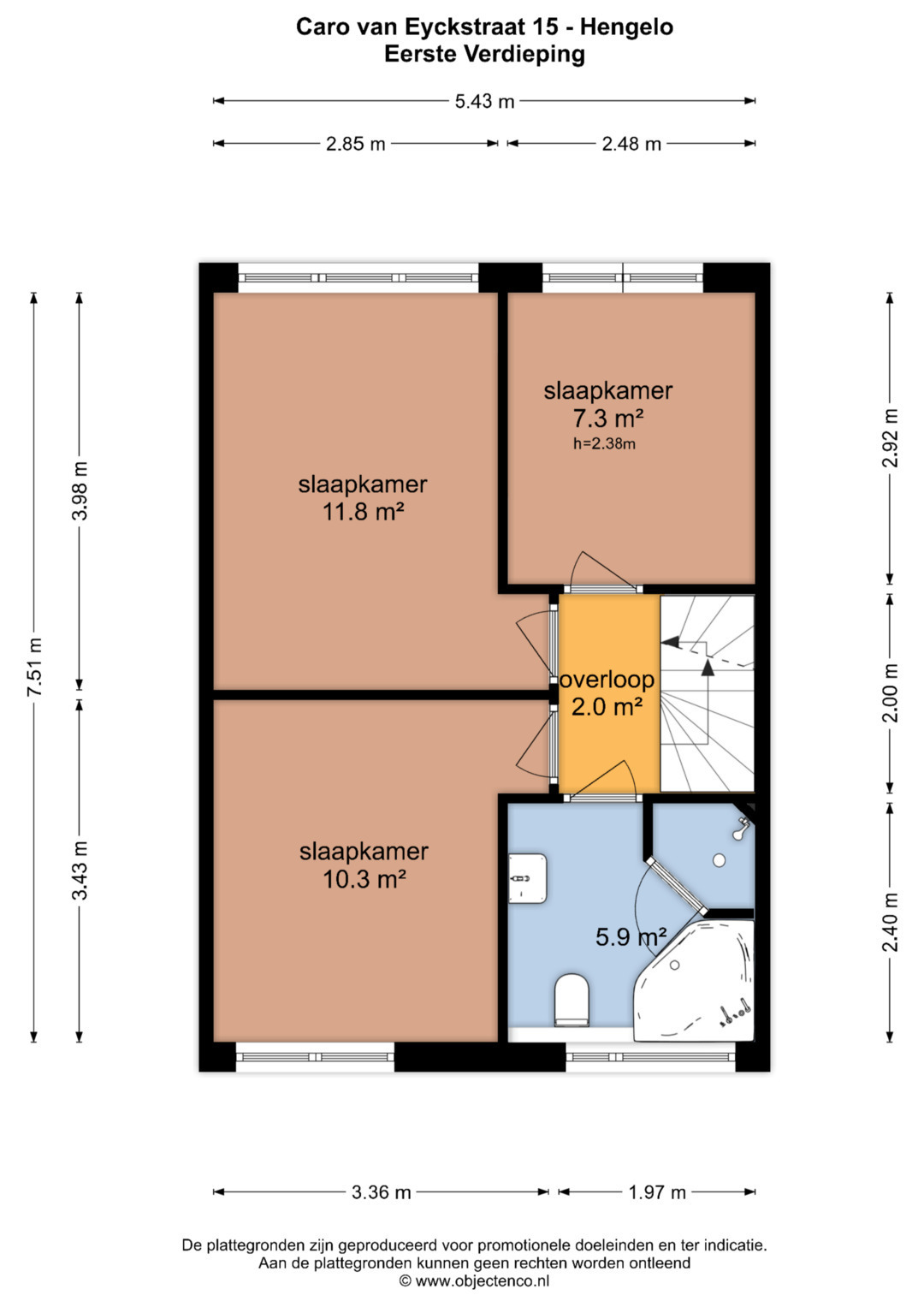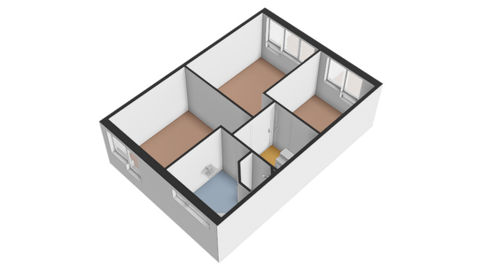 Overloop, drie slaapkamers en de badkamer. De slaapkamers meten oppervlaktes van afgerond 12, 10 en 7 m².