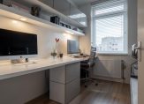 Via de hal is er toegang tot de woonkamer van circa 21 m², voorzien van laminaat met daaronder vloerverwarming. De living kenmerkt zich door de ruime mate aan lichtinval en wordt gescheiden van de keuken middels schuifdeuren, welke in ‘open stand’ verzinken in de wand…. ideaal wanneer u een ruimte wenst af te sluiten om zelf even te relaxen of de kinderen even een uurtje in alle rust wil laten chillen.