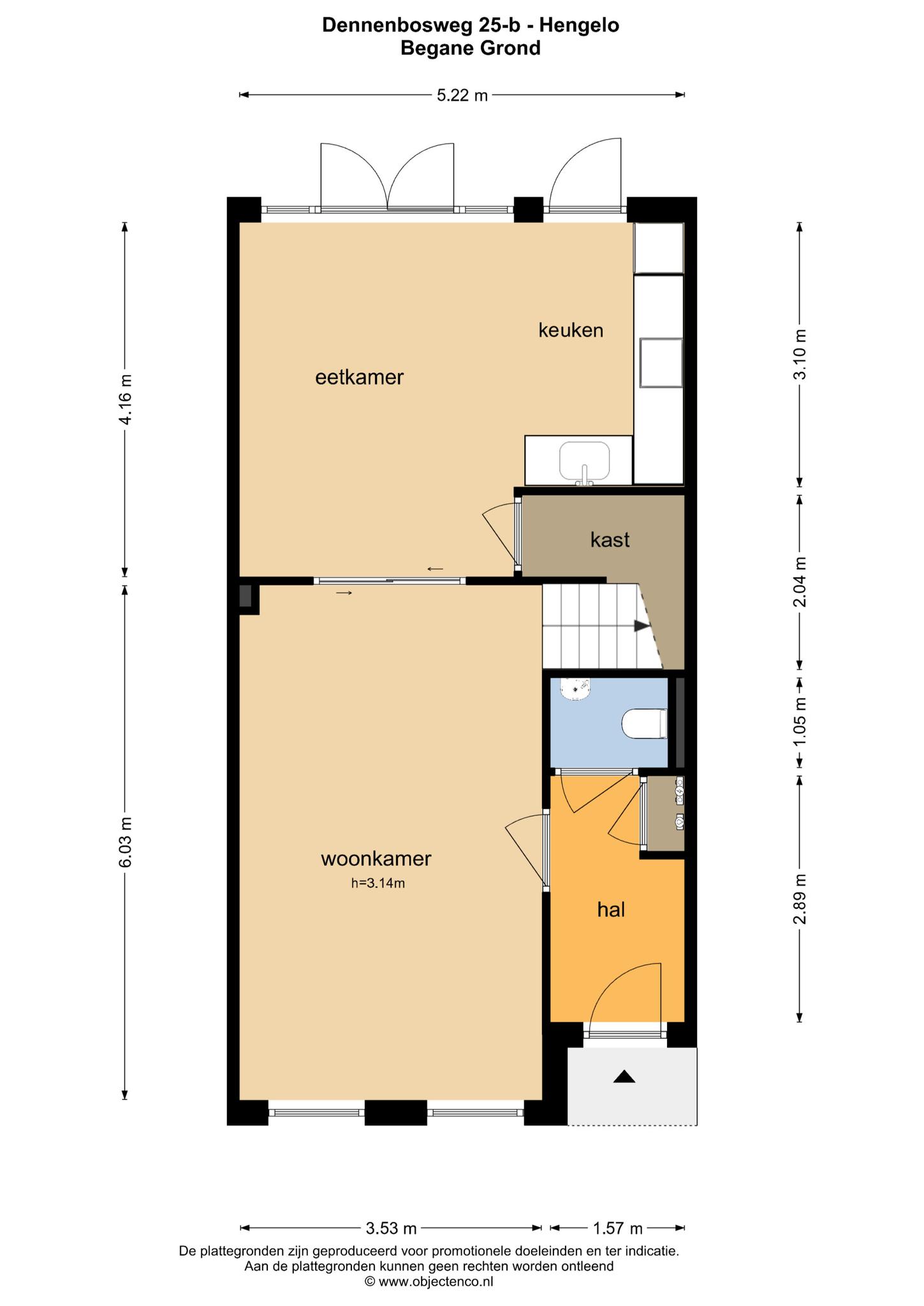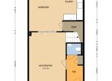 Overdekte entree, hal met meterkast, toilet met fontein, vaste trapopgang naar de eerste verdieping, woonkamer, woonkeuken en een diepe provisiekast.