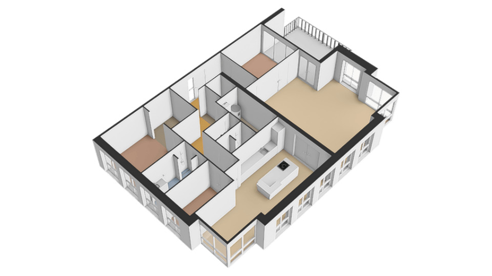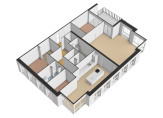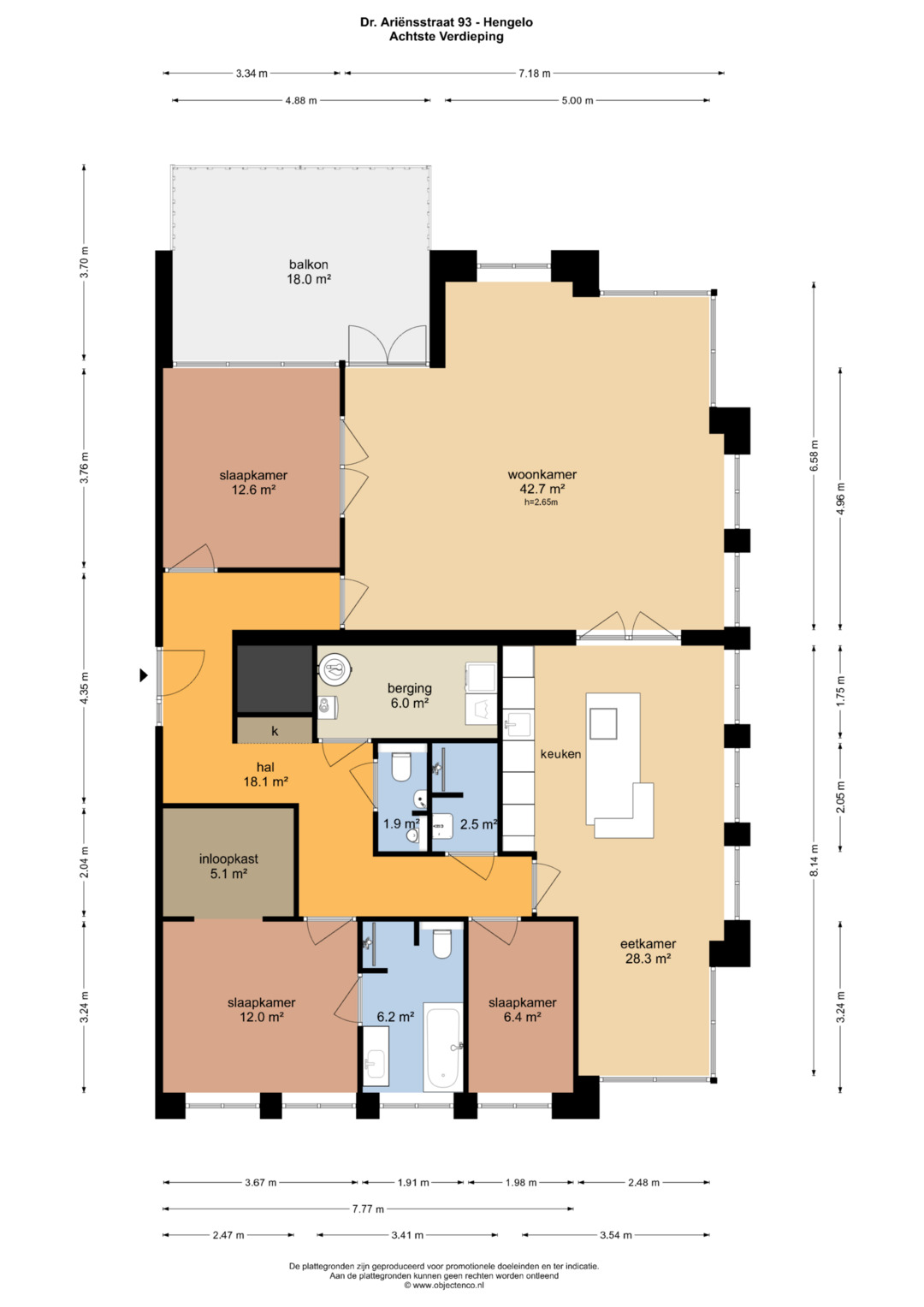 Entree/hal met royale woonkamer, leef-/woonkeuken, drie slaapkamers, twee badkamers, berging/wasruimte, separaat toilet en ruime buitenruimte.