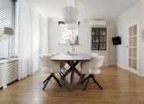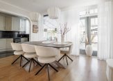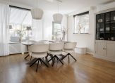 De lichte en ruime woonkamer heeft een oppervlakte van circa 19 m² en is afgewerkt met een laminaatvloer. Aangrenzend aan de woonkamer en keuken bevindt zich de eetkamer, eveneens circa 19 m² groot, voorzien van tuindeuren en uitgerust met airconditioning voor optimaal comfort.