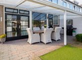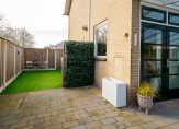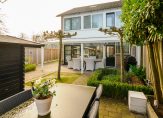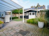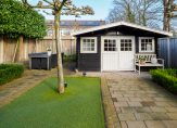 De fraai aangelegde achtertuin is voorzien van borders, kunstgras en bestrating en biedt meerdere comfortabele zitplekken. Dankzij de leibomen geniet u hier van volop privacy. Aansluitend aan de woning bevindt zich een royale overkapping met verlichting, ideaal om tot in de late uurtjes buiten te verblijven. Daarnaast beschikt de tuin over een praktische achterom en een houten tuinhuis van circa 15 m².