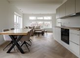 De open keuken is voorzien van een kunststoffen aanrechtblad met een enkele RVS spoelbak. De keuken is uitgerust met diverse inbouwapparatuur, waaronder een RVS afzuigkap, koel-vriescombinatie, 4-pits inductie kookplaat, oven en vaatwasser. Er is voldoende ruimte in de keuken om een eetkamertafel te plaatsen, en door de open opstelling blijft er goed contact met de woonkamer en het balkon.