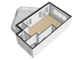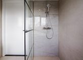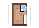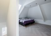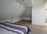 De slaapkamer op de eerste verdieping heeft een oppervlakte van circa 10 m² en is afgewerkt met een PVC-vloer, veel wandcontactdozen en een dakraam. De badkamer, gesitueerd in de dakkapel, beschikt over een douche met glazen wand en een wastafelmeubel en vormt een functionele en lichte ruimte.