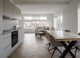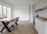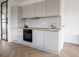 De open keuken is voorzien van een kunststoffen aanrechtblad met een enkele RVS spoelbak. De keuken is uitgerust met diverse inbouwapparatuur, waaronder een RVS afzuigkap, koel-vriescombinatie, 4-pits inductie kookplaat, oven en vaatwasser. Er is voldoende ruimte in de keuken om een eetkamertafel te plaatsen, en door de open opstelling blijft er goed contact met de woonkamer en het balkon.