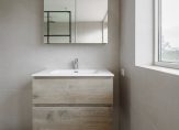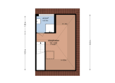 De slaapkamer op de eerste verdieping heeft een oppervlakte van circa 10 m² en is afgewerkt met een PVC-vloer, veel wandcontactdozen en een dakraam. De badkamer, gesitueerd in de dakkapel, beschikt over een douche met glazen wand en een wastafelmeubel en vormt een functionele en lichte ruimte.