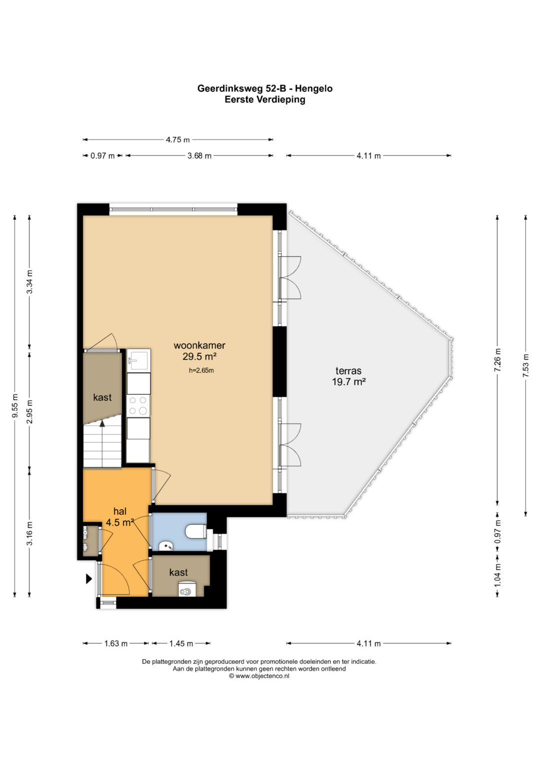 Entree/hal met stalen deur, meterkast, toilet en CV-/bergruimte, woonkamer met toegang tot het balkon en keuken.