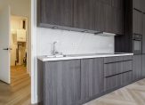 De open keuken is voorzien van een kunststoffen aanrechtblad met een enkele RVS spoelbak. De keuken is uitgerust met diverse inbouwapparatuur, waaronder een RVS afzuigkap, koel-vriescombinatie, 4-pits inductie kookplaat, oven en vaatwasser. Daarnaast beschikt de keuken over veel bovenkasten die doorlopen tot het plafond, wat zorgt voor extra bergruimte en een strakke uitstraling. Er is voldoende ruimte in de keuken om een eetkamertafel te plaatsen en dankzij de open opstelling blijft er prettig contact met de woonkamer.