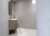 De moderne badkamer is uitgerust met een douche en wastafelmeubel.