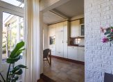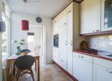 Achter de keuken ligt een praktische bijkeuken met plek voor de wasmachine en wasdroger, vaste kastruimte en een deur naar de achtertuin. Ideaal voor extra bergruimte en dagelijks gebruiksgemak.