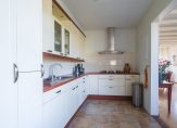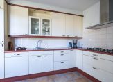 De open verbinding naar de keuken zorgt voor een prettige, ruimtelijke sfeer. De keuken is uitgevoerd in een praktische L-opstelling en voorzien van een complete inbouwkeuken met een enkele spoelbak en een aparte groentenspoel. Daarnaast beschikt u over moderne inbouwapparatuur, waaronder een 5-pits gaskookplaat, een rvs-afzuigkap, vaatwasser, koelkast en een oven.