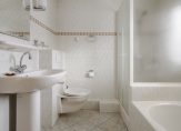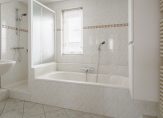 De badkamer is geheel betegeld in lichte kleurstelling en uitgerust met een douche, ligbad, wastafel, toilet en designradiator. De ventilatie geschiedt op zowel mechanische als natuurlijke ventilatie, wat zorgt voor een frisse en aangename ruimte.