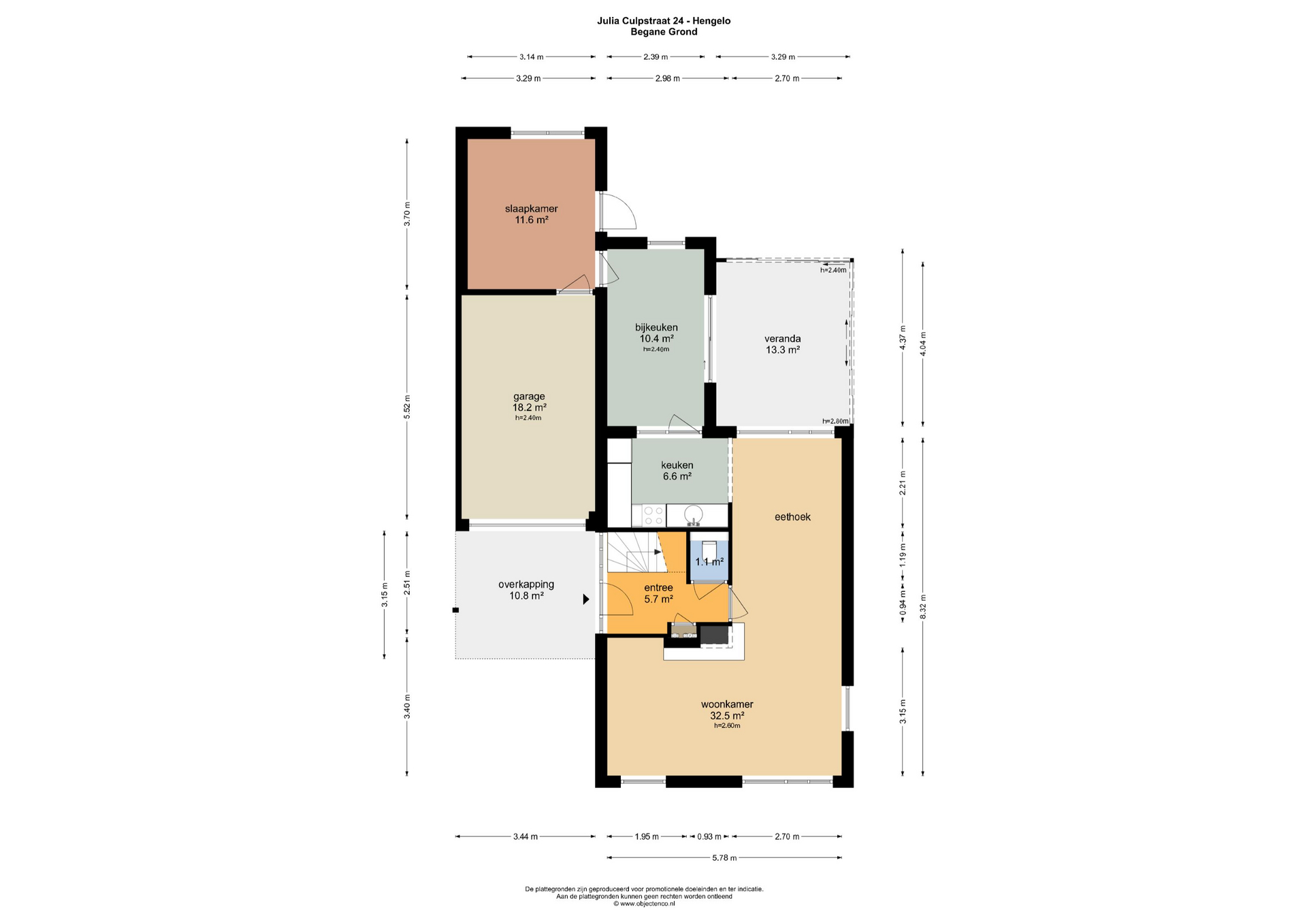 Entree/hal met meterkast, toilet, woonkamer, half open keuken, slaapkamer/kantoorruimte, veranda, bijkeuken en de garage.