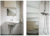 De betegelde badkamer is voorzien van een douche en wastafel. Ventilatie geschiedt op natuurlijke wijze.