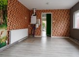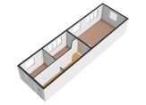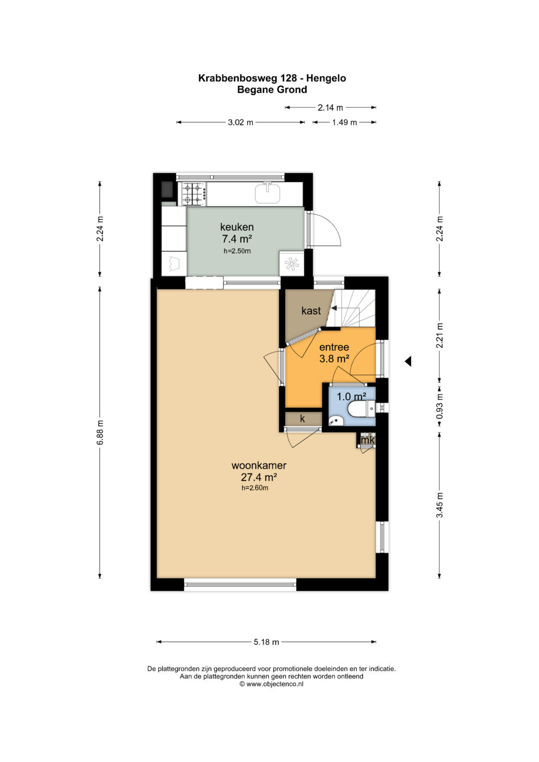 Entree/hal met toilet, trapkast en vaste trapopgang naar de eerste verdieping, woonkamer met meterkast en keuken.
