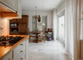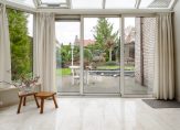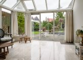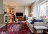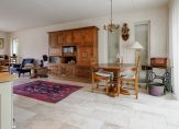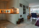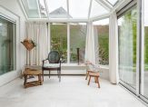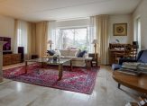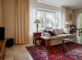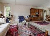 De ruime, L-vormige woonkamer van circa 44 m² vormt het comfortabele hart van de woning. Dankzij de stijlvolle Travertin vloer (met vloerverwarming) en de sfeervolle gaskachel is dit een aangename plek om het hele jaar door te verblijven. De aangrenzende serre (12 m²) aan de achterzijde zorgt voor een prettige, natuurlijke lichtinval en biedt een heerlijk zitgedeelte met uitzicht op de tuin. Via de schuifpui loopt u zo de achtertuin in, wat zorgt voor een fijne verbinding tussen binnen en buiten en optimaal woongenot op de begane grond.