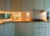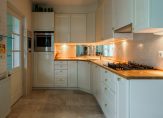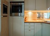De keuken is praktisch ingedeeld in een hoekopstelling en van alle gemakken voorzien. Het aanrechtblad met geïntegreerde dubbele spoelbak en de aanwezige inbouwapparatuur, waaronder een 4-pits gaskookplaat, afzuigschouw, oven, koelkast en vaatwasser maken koken comfortabel en overzichtelijk. Er is bovendien volop kast- en bergruimte aanwezig.