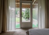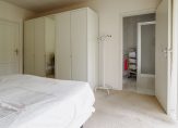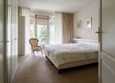 De royale slaapkamer van circa 18 m² is voorzien van vloerbedekking en biedt directe toegang tot zowel de achtertuin als de badkamer. De badkamer heeft een verzorgde, tijdloze uitstraling en is ingericht met een douche en twee wastafels. Dankzij de natuurlijke ventilatie is het hier prettig en fris, wat bijdraagt aan dagelijks comfort en gebruiksgemak.