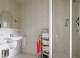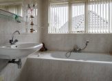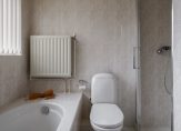 De badkamer op deze verdieping heeft een courante uitstraling en is compleet uitgevoerd. De ruimte is uitgerust met een ligbad, douche met cabine, toilet, een wastafel en een radiator. Dankzij de natuurlijke ventilatie blijft de badkamer fris en aangenaam in gebruik.