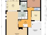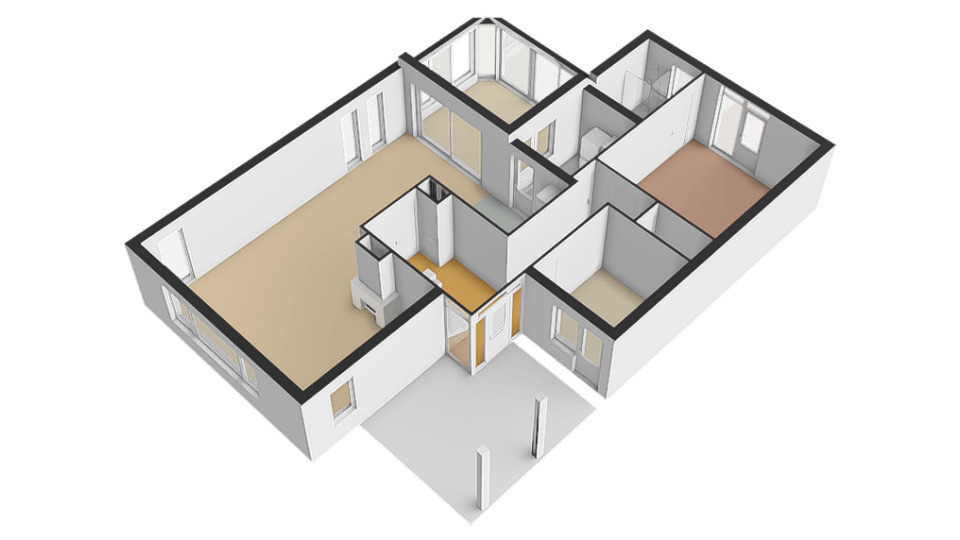 Entree/hal met meterkast en toilet, woonkamer met serre, keuken, bijkeuken, slaapkamer, kantoorruimte (evt. tweede slaapkamer) en de badkamer.