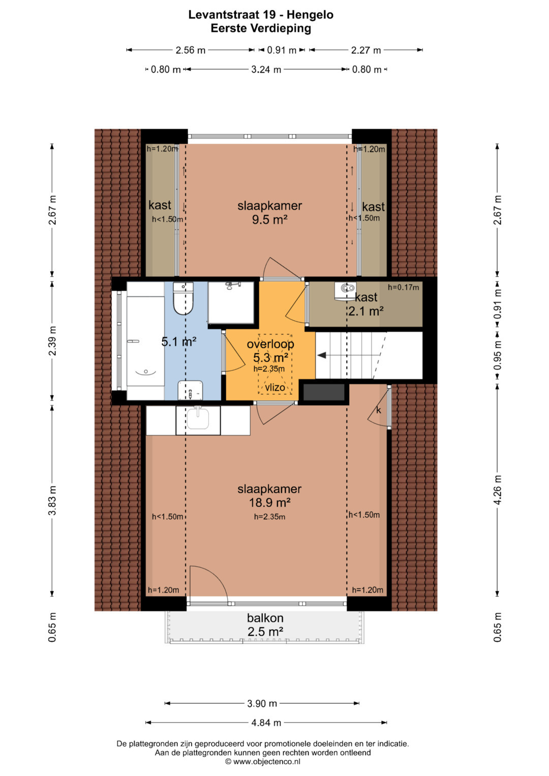 Overloop met vaste kastruimte (hier vinden we de opstelplaats voor de cv-ketel), twee slaapkamers en de badkamer.