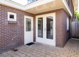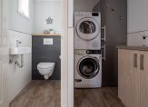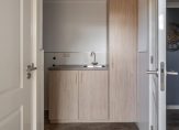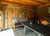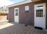 Het achter portaal/bijkeuken geeft toegang tot de toiletruimte. Daarnaast vinden we in de bijkeuken de aansluitingen voor wasmachine en wasdroger. Tevens bevindt zich hier een keukenblok met uitstortgootsteen (alleen koud water).