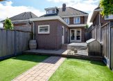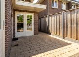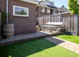 De op het noorden gelegen achtertuin is aangelegd met bestrating, hoogwaardig kunstgras, beplanting en een gazon.