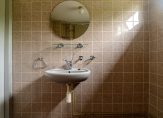 De badkamer meet een oppervlakte van bijna 6 m² en is betegeld in lichte kleurstelling. Het geheel is eenvoudig doch functioneel. De badkamer is voorzien van een staand toilet, vaste wastafel en een douche. Tevens vinden we hier een aansluiting voor de wasmachine. Ventilatie geschiedt op natuurlijke wijze.