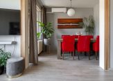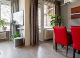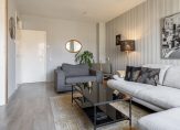 De living van circa 27 m² (totaal woon-/eetkamer) is voorzien van een laminaatvloer in lichte kleurstelling. De in grote getale aanwezige raampartijen zorgen voor extra daglicht. Tevens grenst aan de eetkamer een balkon en deze is via een openslaande deur eenvoudig te bereiken. De woonkamer beschikt over een airconditioning voor het verwarmen en verkoelen van het appartement.