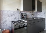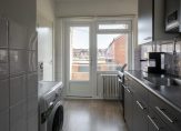 Vanuit de hal is er toegang tot de dichte keuken van circa 6 m². Als bewoner heeft u de beschikking over een keukenblok met kunststoffen aanrechtblad waarin verwerkt een enkele RVS spoelbak. Als (losse) apparatuur een 4-pits gaskookplaat met oven, RVS afzuigkap, wasmachineaansluiting en een koelkast. Daarnaast grenst aan de keuken het tweede balkon welke te bereiken is via een openslaande deur.