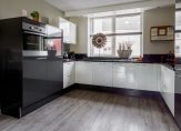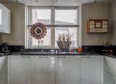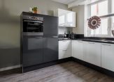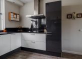 Aan de voorzijde van de woning bevindt zich een sfeervolle halfopen keuken met een moderne inbouwkeuken, uitgevoerd in een praktische U-opstelling. De keuken is afgewerkt in een lichte kleurstelling met een stijlvol donker granieten werkblad en voorzien van diverse inbouwapparatuur, waaronder een RVS afzuigkap, 4-pits inductiekookplaat, koelkast, 3-laden vriezer, vaatwasser en een oven.