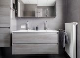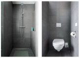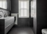 De moderne badkamer is volledig betegeld en uitgevoerd in een stijlvolle antracietgrijze kleurstelling. U beschikt over een breed dubbel wastafelmeubel, een ruime inloopdouche met drain en een modern hangend toilet. Voor optimaal comfort zijn er vloerverwarming en een designradiator aanwezig, waardoor de badkamer zowel luxe als functioneel is.