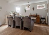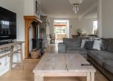 De living (opgedeeld in eet- en zitgedeelte) meet een oppervlakte van circa 39 m² en is aan de voorzijde voorzien van een fraaie erker. De vloer is voorzien van massief parket en de woonkamer is L-vormig qua indeling. Voor de liefhebber is er een houtkachel aanwezig.