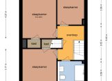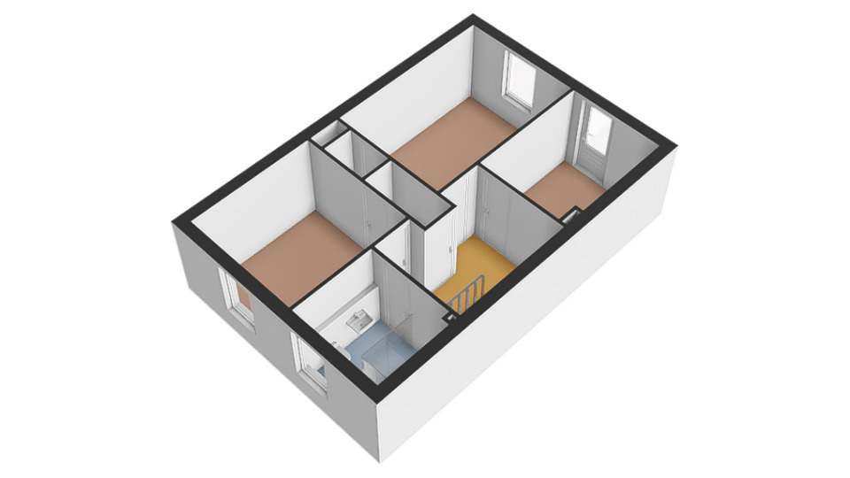 Overloop, drietal slaapkamers en de badkamer. De slaapkamers meten respectievelijk 13, 10 en 7 m², waarvan er twee beschikken over een vaste kastruimte.