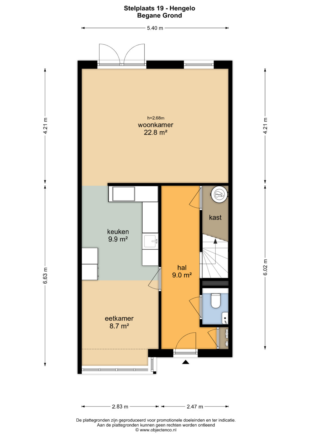 Entree, hal met garderobe en meterkast, technische ruimte, toilet, tuingerichte woonkamer in L-vorm met openslaande deuren naar de tuin, open keuken met inbouwapparatuur en de eetkamer.