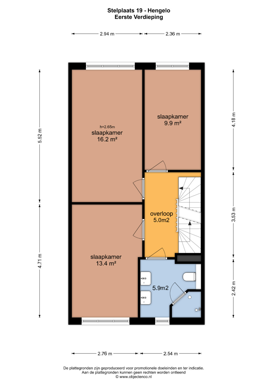 Op de eerste verdieping bevinden zich drie ruime slaapkamers van respectievelijk circa 16 m², 13,5 m² en 10 m². Alle kamers zijn licht, praktisch ingedeeld en bieden volop mogelijkheden als slaap-, werk- of kinderkamer.