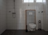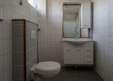 De badkamer meet respectievelijk circa 5 m² en is uitgerust met een wastafelmeubel, douchehoek en toilet.