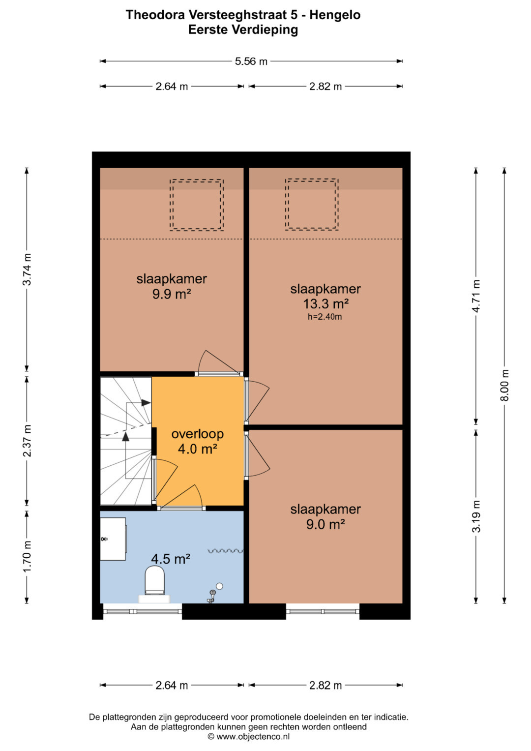 De slaapkamers meten circa 13, 10 en 9 m². De slaapkamers zijn alle drie voorzien van een laminaat vloer. De twee slaapkamers aan de achterzijde zijn voorzien van een dakraam.