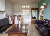 De woonkamer meet een oppervlakte van circa 18 m² en via dubbele openslaande deuren is er toegang tot de aan de woning vast gebouwde overkapping en tuin.