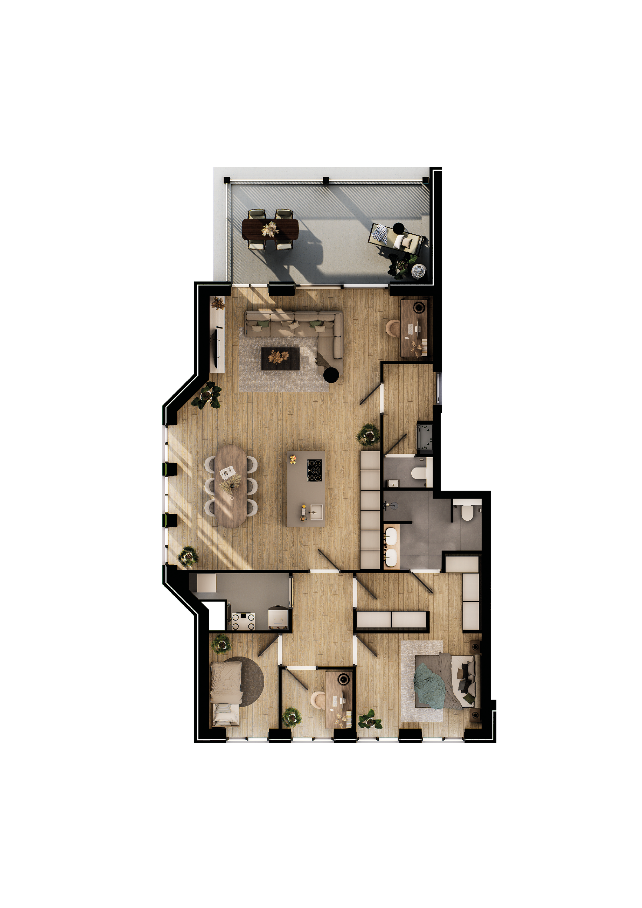 De moderne badkamer is naar je eigen smaak ingericht, de ruimte, je royale douche en de dubbele wastafel geven je het gevoel van een hotel chique allure. Je eerste koffie van de dag maak je in je eigen keuken met kookeiland waar je gisteren nog met vrienden gezellig gekookt hebt. De zon lokt je naar je balkon op het zuiden waar je door het privacy scherm heerlijk van de eerste zonnestralen op je mooie beschutte terras kunt genieten. Je kijkt uit over de stad en het groen van de Drienerbeek, heerlijk rustig en toch middenin de stad.