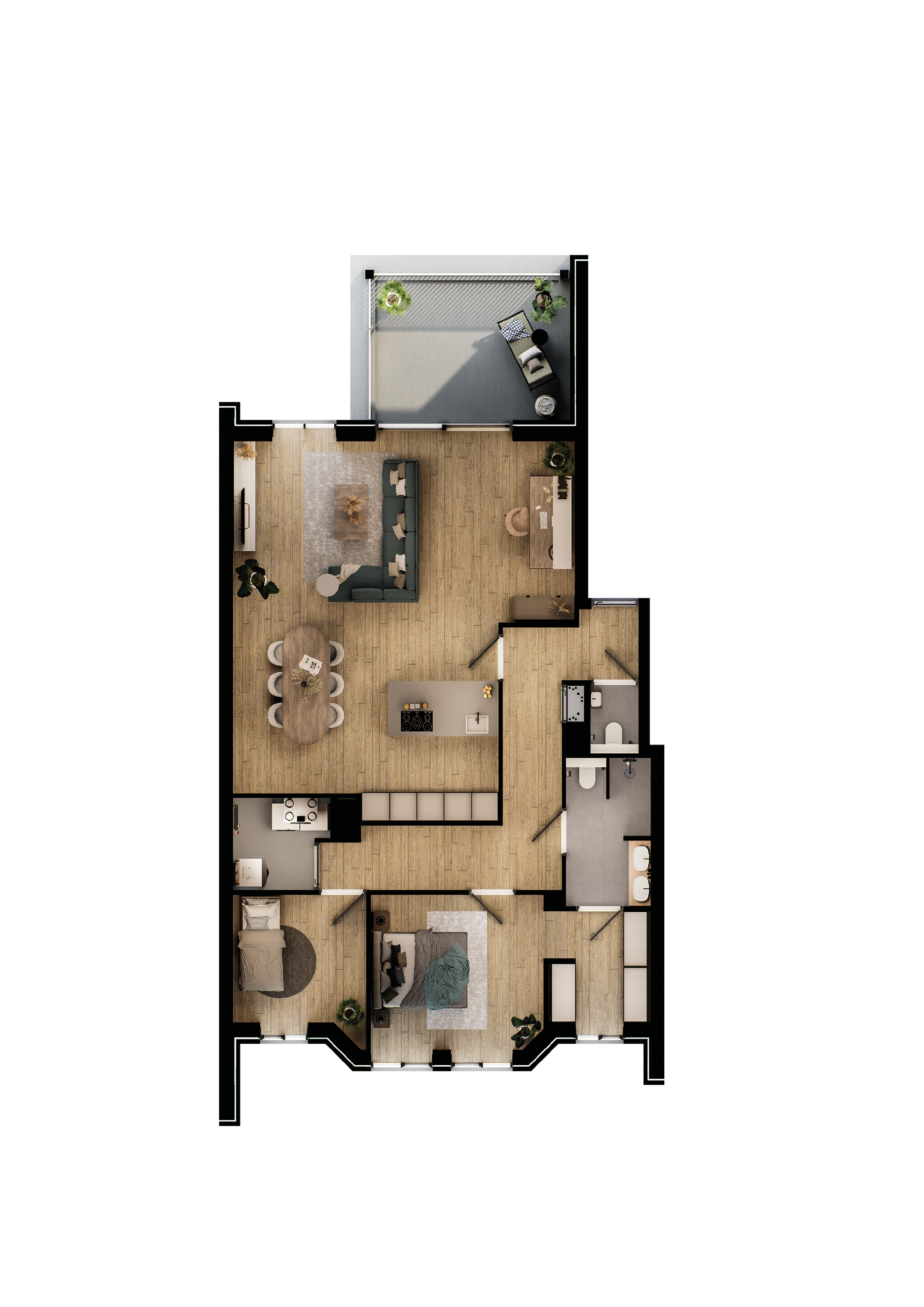 * Het appartement wordt opgeleverd zonder keuken, maar met standaard aansluitpunten.