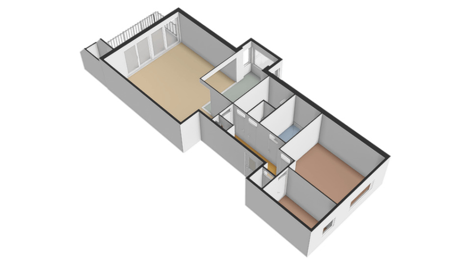 De hal biedt toegang tot een tweetal slaapkamers, het toilet, de inpandige berging (bijkeuken) en de badkamer. De slaapkamers meten afgerond 15,5 en 5,5 m².