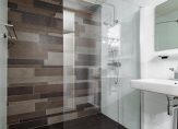 De moderne en fraaie badkamer is volledig betegeld in een moderne kleurstelling en beschikt over een inloopdouche, een wastafel en een radiator. De ventilatie geschiedt op mechanische wijze.