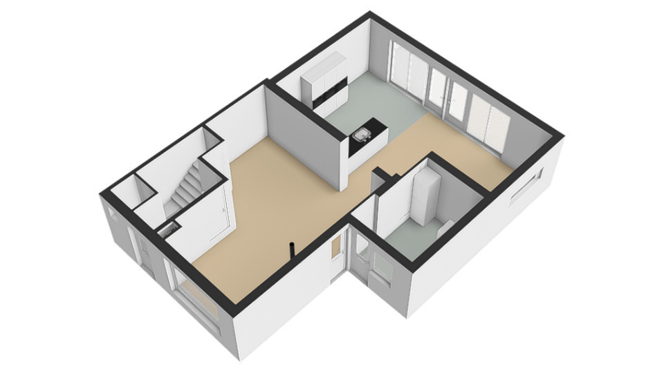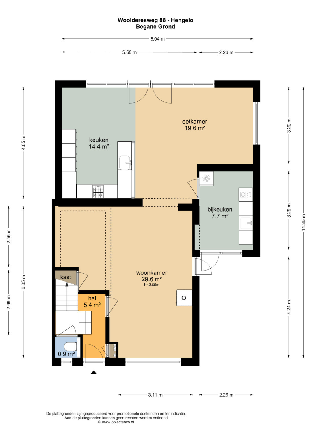 Hal met meterkast, toilet, trapopgang naar de eerste verdieping, woonkamer met provisiekast, woonkeuken en de toegang tot de bijkeuken.