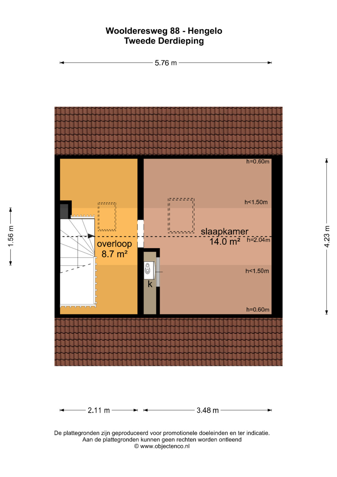 Via een vaste trap is de tweede verdieping bereikbaar. Hier bevindt zich een royale slaapkamer van ca. 14 m², voorzien van dakvensters die zorgen voor een aangename lichtinval. Daarnaast is er praktische bergruimte achter de knieschotten. Achter een vaste kast is de opstelplaats van de Cv-ketel netjes weggewerkt.