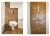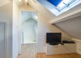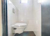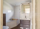 De geheel betegelde badkamer biedt optimaal comfort met een ligbad, stijlvol wastafelmeubel, toilet en designradiator. Dankzij natuurlijke ventilatie is er altijd een frisse en aangename atmosfeer.
