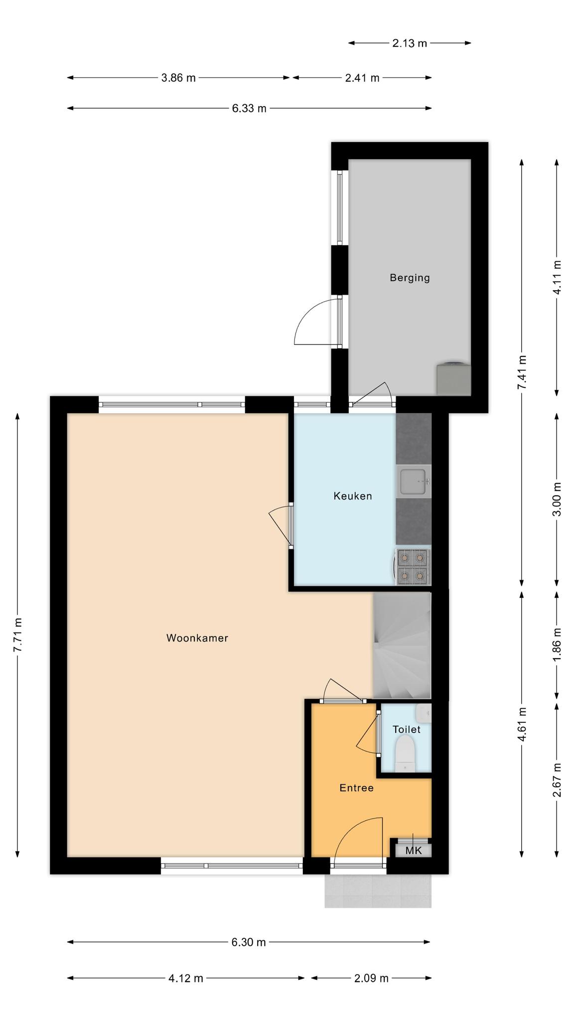 Op de begane grond de hal/entree, meterkast en toiletruimte; royale doorzon woonkamer met open trap naar de verdieping; Dichte keuken met eenvoudige keukeninrichting; aangebouwde berging met achterom naar de tuin.