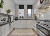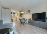 o.a. hal/entree met trapopgang, meterkast en toiletruimte; woonkamer met veel lichtinval door de grote raampartij met deur naar de tuin en zonwering aan de buitenkant; aan de straatkant een nette open keuken voorzien van diverse inbouwapparatuur.
